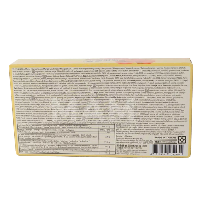 Diese besondere Mochi-Variante vereint den exotischen Geschmack von süßer Mango mit der samtigen Textur des Klebreisteigs. Hergestellt in Taiwan, ist sie ein Muss für alle, die asiatische Süßwaren lieben.