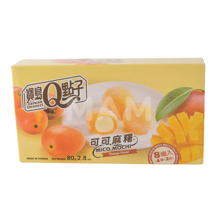 TW Q Mico Mochi Mango 80G ist ein exotischer Mochi-Snack aus Taiwan mit weichem Klebreisteig und süßer Mangocremefüllung. Perfekt für Liebhaber exotischer Desserts und asiatischer Süßigkeiten.